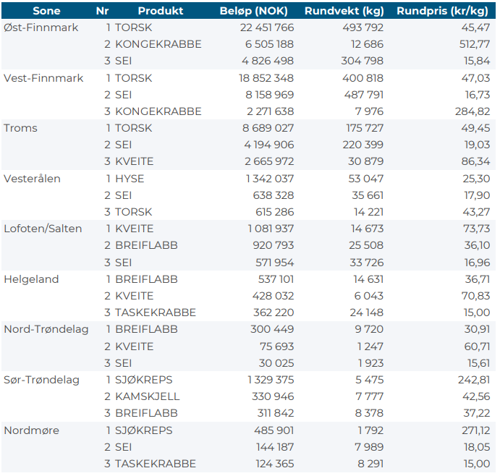 Det ble omsatt 26 tonn ferske reker i uke 45 til en verdi på 1,9 millioner kroner, ned fra 36 tonn / 2,6 millioner kroner uka før. Fordelt på fangstfelt ble det fisket mest i Kvænangen med 6 tonn, deretter Malangen med 5 tonn, 4 tonn i Varangerfjorden, 2 tonn i Vågsfjorden, og 1,3 tonn hver ved Glomfjorden, i Fugløysundet, i Balsfjorden og i Andfjorden. Kvanta under 1 tonn i resterende fangstfelt.