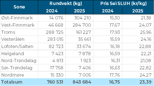 Omsetningen av fersk sei i uke 45 utgjorde 1.110 tonn til en verdi av 19 millioner kroner, opp fra 880 tonn/15 millioner kroner i uke 44. Kvanta per leveringssone (unntatt trål) fremgår av tabell 4. Redskapsfordelingen var 430 tonn på snurrevad, 310 tonn på garn, 260 tonn på trål, 40 tonn på juksa og tilsvarende på line/autoline. Sammenlignet med uka før var det økte landinger fra trål og snurrevad, reduksjon for garn, juksa og lina. Geografisk var størst kvantum levert i Finnmark med 790 tonn, fordelt med 490 tonn i vest- og 300 tonn i østfylket, deretter 220 tonn i Troms, 30 tonn i Vesterålen og det samme i Lofoten/Salten. Mindre enn 10 tonn i øvrige leveringssoner. Snurrevadseien var fordelt med 300 tonn i Øst-Finnmark og 130 tonn i Vest-Finnmark. Garnseien var i hovedsak levert i Vest-Finnmark med 140 tonn og Troms med 120 tonn. 4 trålere leverte fersk sei, 3 av dem med 200 tonn i Rypefjord og en med 60 tonn i Senjahopen. Juksaseien var mer spredt fordelt. Det meste av lineseien var levert i Lofoten/Salten og Vesterålen.