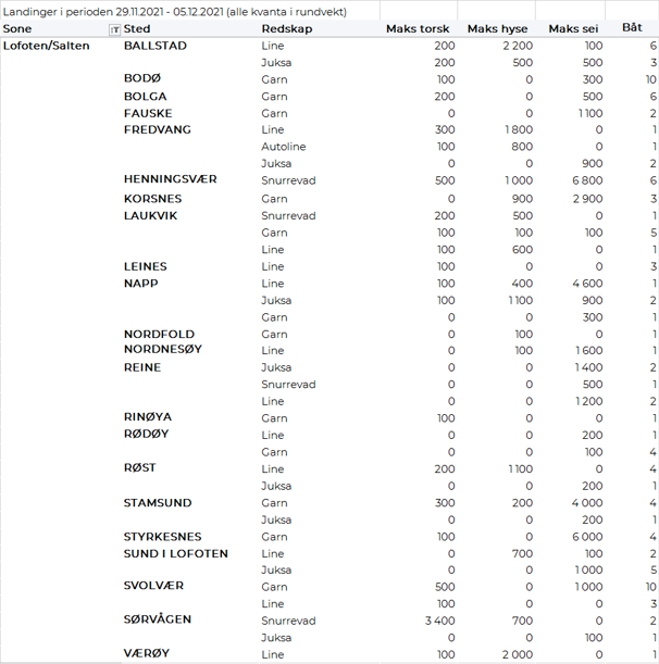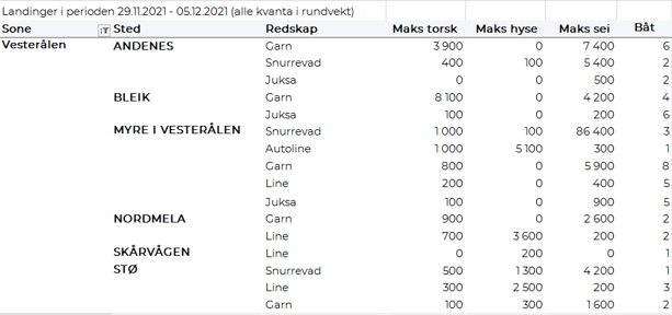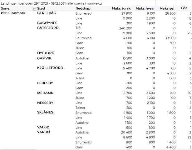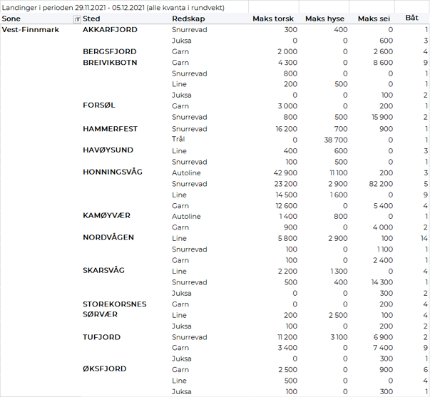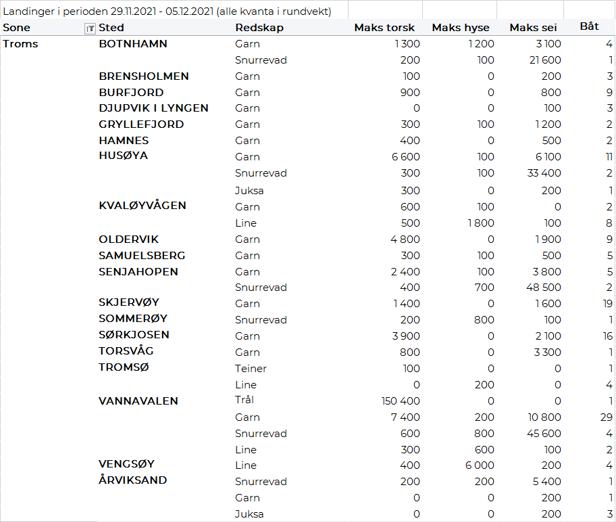 Ser vi på omsetningen av ferskt råstoff totalt for Råfisklagets distrikt, er det en økning fra 28 millioner i uke 47 til 33 millioner i uke 48. I likhet med uken før var torsken størst i verdi også i uke 48 med 39 millioner kroner av et kvantum på 1.841 tonn, opp fra 1.190 tonn/24,6 millioner kroner uka før. Kvantumet av fersk torsk i uke 48 var fordelt med 756 tonn på line/autoline, 481 tonn på garn, 390 tonn på trål og 200 tonn på snurrevad. Sammenlignet med uka før var det økninger på de fleste redskaper med unntak av snurrevad. Størst økning var det på trål som økte med 340 tonn fra uken før. Den geografiske fordelinga var 914 tonn levert Øst-Finnmark, 352 tonn i Vest-Finnmark, 446 tonn i Troms, 96 tonn i Vesterålen, kvanta under 19 tonn i resterende soner. Økende aktivitet i alle soner sammenlignet med uken før. Størst økning var det i Troms som er opp med 263 tonn fra uken før. I hovedsak skyldes økningen en leveranse fersk torsk fra trål til Vannøya, men også Husøya drar opp der garnbåtene har økt sine fangster med 96 tonn fra uka før og antallet landinger gikk opp fra 13 i uke 47 til 44 i uke 48. Aktiviteten på Kvænangen er fortsatt økende, størst økning er det for leveranser til Sørkjosen som er opp med 13 tonn fra uka før til 50 tonn, deretter følger Skjervøy som øker med 2 tonn til 41 tonn.