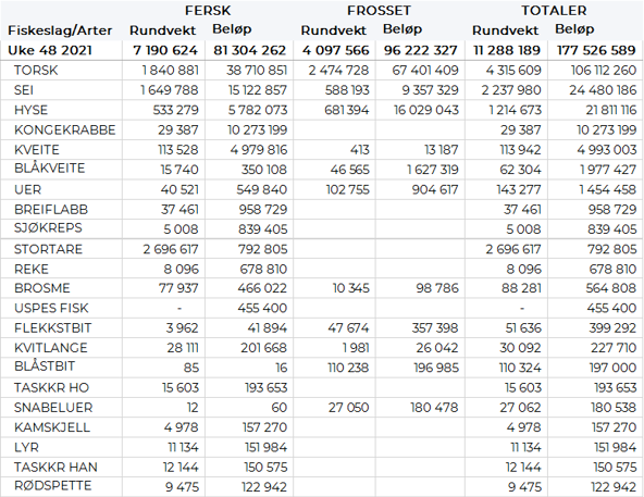 Råfisklagets omsetning i uke 48 ble på 181 millioner kroner, som var ned fra 226 millioner kroner uka før. I tallet for uke 48 inngår 3 millioner kroner som gjaldt landing fra en russisk autolinebåt. Omsetningen for norske båter stod dermed for 178 millioner kroner, fordelt med 81 millioner kroner på fersk og 96 millioner kroner på fryst råstoff.