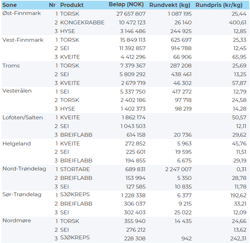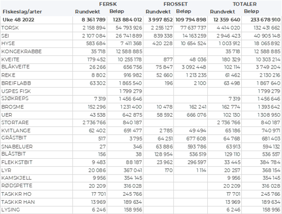 Omsetningen av ferskt råstoff i uke 48 utgjorde 124 millioner kroner, opp fra 101 millioner kroner uka før. Torsk, sei og kongekrabbe var størst i verdi med 12-55 millioner kroner på hver, og for øvrig slik det framgår av tabell 2. Bak de 3 kom kveita med alle tiders største ukeomsetning på 10 millioner kroner.