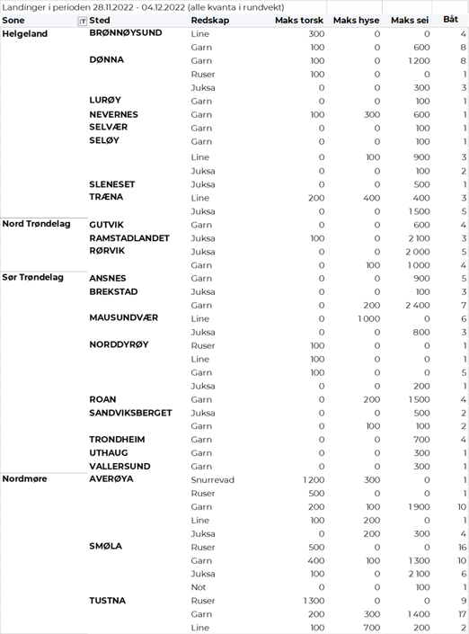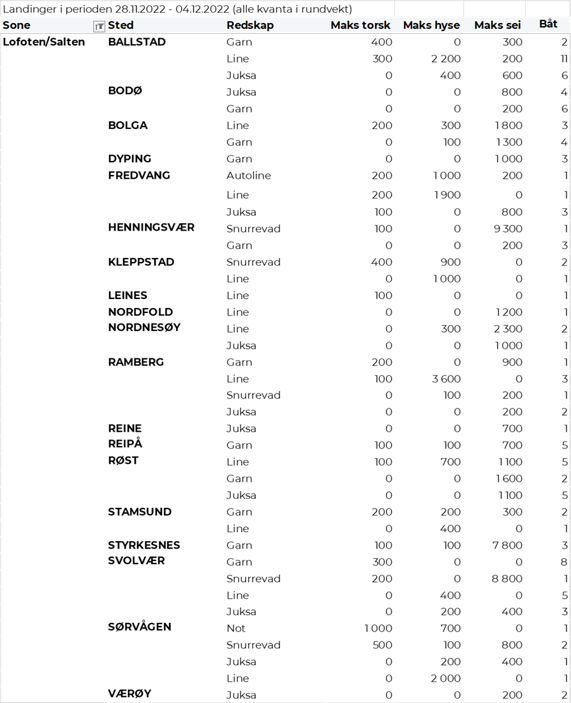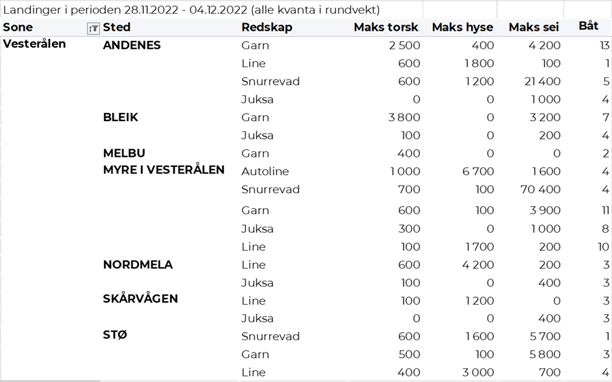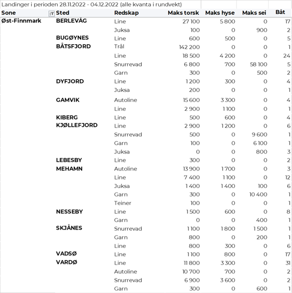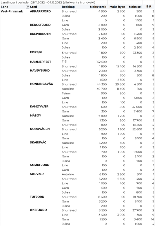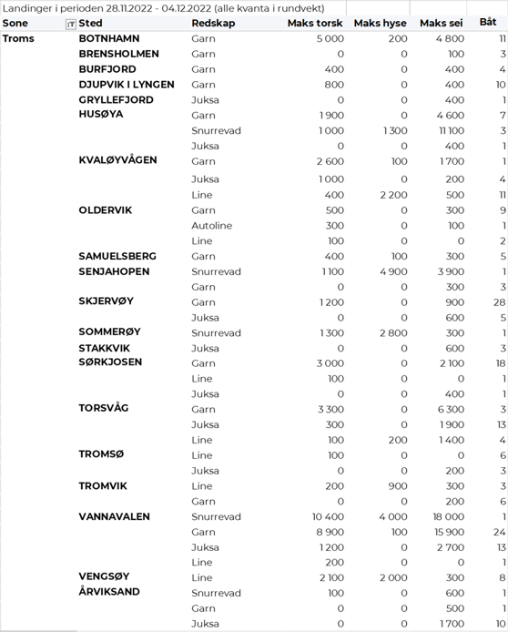 Omsetningen av fersk torsk utgjorde 2.160 tonn til verdi 55 millioner kroner, opp fra 1.590 tonn og 40 millioner kroner uken før. Line/autoline stod for 1.040 tonn, 450 tonn på garn, 340 tonn på snurrevad og 290 tonn var tatt på trål. Trålkvantumet var opp fra 220 tonn uka før, garn opp fra 360 tonn, line/autoline opp fra 730 tonn, og snurrevad opp fra 250 tonn. 890 tonn av linetorsken var levert i Øst-Finnmark. 260 av de 450 tonnene garntorsk var levert i Troms, og 90 tonn hver på Vest-Finnmark og Vesterålen. Det meste av garnfisket foregår i Nord-Troms med blanding av sei og torsk som jakter på sild. Av de 340 tonnene fra snurrevad var 250 tonn levert i Vest-Finnmark og 40 tonn i Øst-Finnmark. Av totalt 2.160 tonn fersk torsk omsatt i uke 48 var 1.090 tonn levert i Øst-Finnmark, 630 tonn i Vest-Finnmark, 300 tonn i Troms og 110 tonn i Vesterålen.