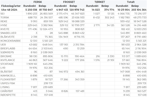 Omsetningen av ferskt råstoff i uke 48 utgjorde 82 millioner kroner, opp fra 78 millioner kroner uken før. Sei, torsk, kveite, kongekrabbe, hyse, breiflabb og sjøkreps stod for det meste av ferskomsetningen, jf. tabell 1.