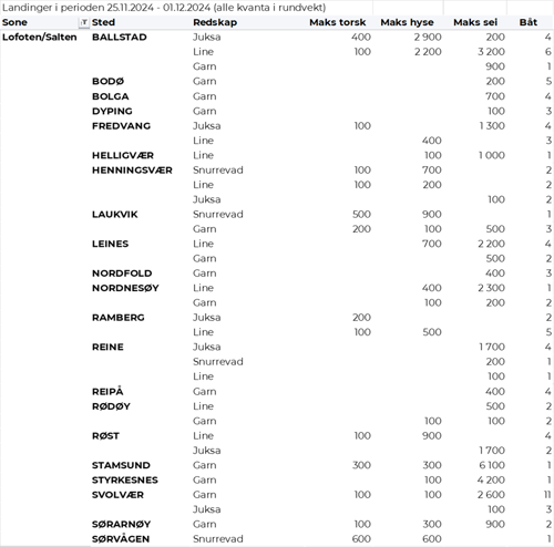 Hittil i år, pr november, er Råfisklagets totalomsetning 15,1 milliarder kroner, som er vel 1,6 milliarder kroner lavere enn til samme tid i fjor. Omsetningen for utenlandske båter er imidlertid opp med vel 0,5 milliarder kroner, til 2,45 milliarder kroner. For norske båter er det dermed en reduksjon på nærmere 2,2 milliarder kroner, fra 14,85 milliarder kroner i fjor til 12,7 i år.