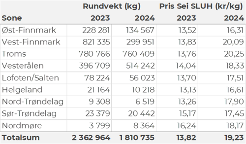 Tabell 4: Omsetning av fersk sei, A og ekstra kvalitet fra norske båter sammenlignet med samme uke i fjor. Fra redskapene garn, jukse, line, snurrevad og not, eksklusiv restråstoff.