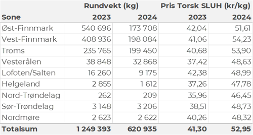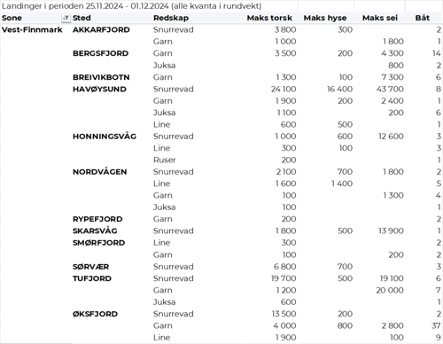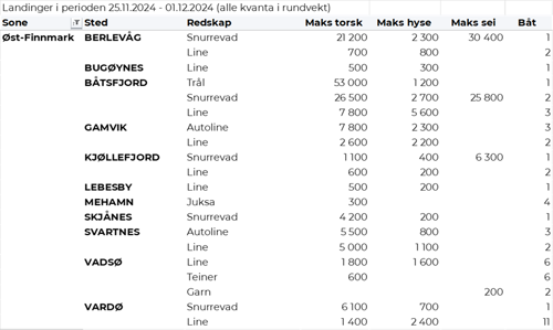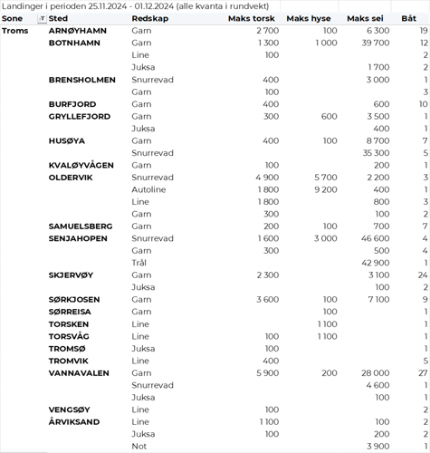Omsetningen av fersk torsk i uke 48 utgjorde 690 tonn til en verdi av 24 millioner kroner, ned fra 710 tonn og 25 millioner kroner uken før. 430 tonn var levert i Finnmark, av det 230 tonn i østfylket, og 200 tonn i Troms. Av kvantumet levert Øst-Finnmark var 90 tonn tatt på snurrevad, 70 tonn på line/autoline og 50 tonn var tråltorsk. Leveransene i Vest-Finnmark var i hovedsak tatt på snurrevad med 120 tonn og garn med 70 tonn. Det meste av de 200 tonnene som var levert i Troms var tatt på garn i nordfylket der fisken følger sildeinnsiget.