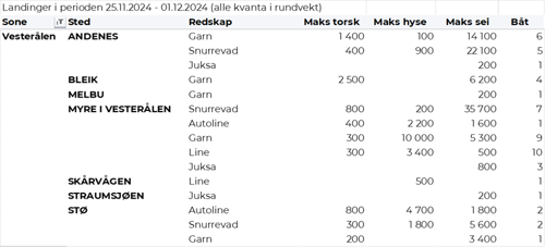 Når det gjelder landinger av fryst råstoff i uke 48 som bare delvis er omsatt, har vi totale landinger på 4.420 tonn, ned fra 5.050 tonn i uke 47. Autoline stod denne gang for størst kvantum med 2.380 tonn levert av 3 båter, der torsk utgjorde 1.370 tonn og 690 tonn var hyse. 1.570 tonn var levert av 6 trålere, av det var 820 tonn torsk, 360 tonn sei og 300 tonn snabeluer. 2 garnbåter leverte 410 tonn, herav 360 tonn sei. Videre var en snurrevadbåt inne med 60 tonn, i hovedsak sei.