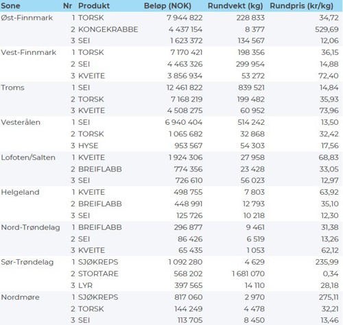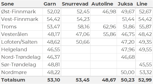Tabell 2 og 3 viser fordelingen av landingene av fersk torsk pr leveringssone og redskap (unntatt trål), med tilhørende snittpriser. De to tabellene er basert på omsetning av kvalitet A og ekstra, der alle leveringstilstander inngår, men der snittprisene er omregnet til sløyd uten hode-priser, eksklusiv restråstoff.