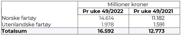 Tilsvarende for uke 49 i fjor var omsetninga 358 millioner kroner, av det var 17 millioner kroner etter landinger fra utenlandske båter. Omsetningen for norske båter på 341 millioner kroner var fordelt med 82 på fersk og 259 på fryst råstoff.