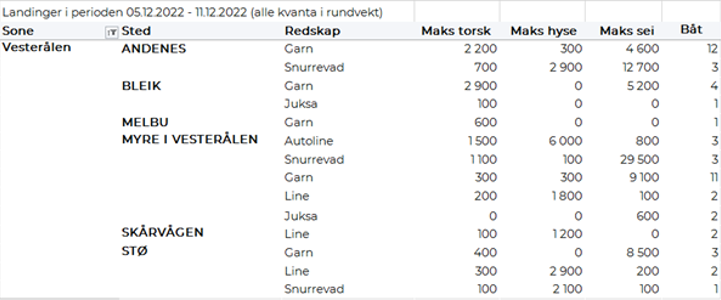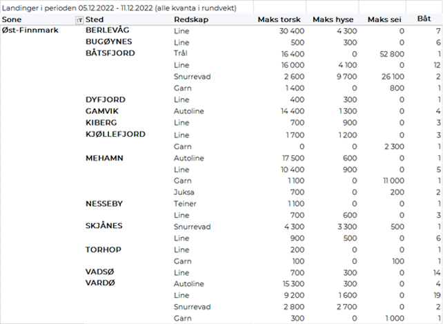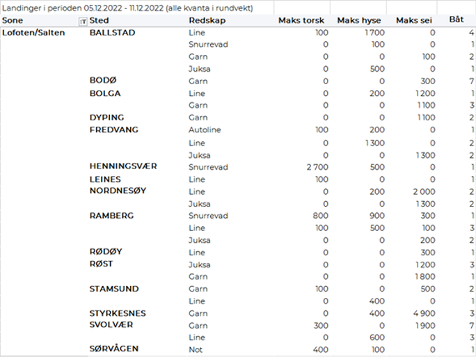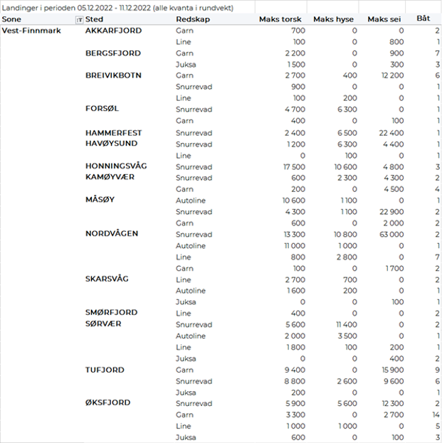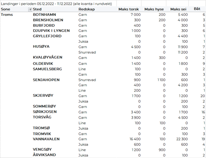 I takt med årstiden er havfiskeflåtens fiske nord i Barentshavet det fiskeriet med størst aktivitet, mens kystflåtens fiske gradvis avtar frem mot jul. Forrige ukes tall viser at kystflåtens leveranser av torsk, sei og hyse ble redusert opp mot 50 % fra uka før. Samtidig er det altså økende frekvens i leveransene av sjøfryst torsk, sei og hyse fra havfiskeflåten til frysehoteller langs kysten. Fisken selges på auksjon til norske førstehåndskjøpere som blant annet lager produkter av klippfisk.