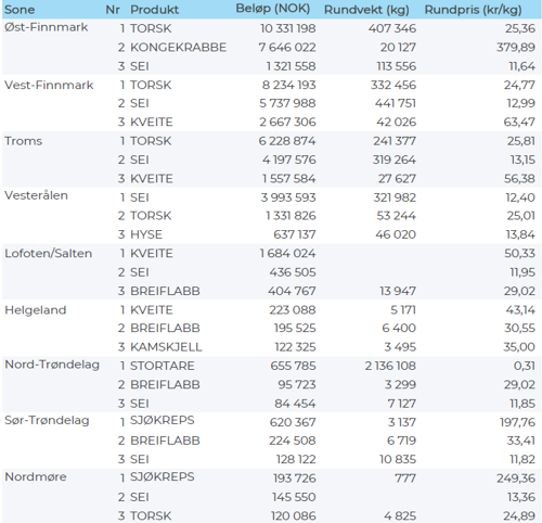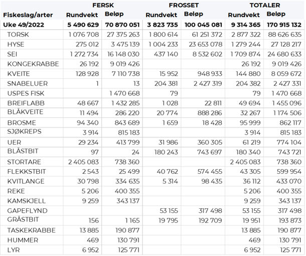 Omsetningen av ferskt råstoff i uke 49 utgjorde 71 millioner kroner, ned fra 125 millioner kroner uka før. Torsk, sei og kongekrabbe var størst i verdi med 9-27 millioner kroner på hver, og for øvrig slik det framgår av tabell 2. Bak de 3 kom kveita med ukeomsetning på 7 millioner kroner.