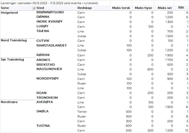 Omsetningen av fersk sei i uke 49 utgjorde 1.273 tonn til en verdi av 16,1 millioner kroner. En nedgang fra 2.110 tonn/27 millioner kroner uken før. Vest-Finnmark var nok en gang størst i kvantum med 443 tonn, hvorav 256 tonn tatt med Snurrevad. Deretter følger Vesterålen med 322 tonn og Troms med 319 tonn. Både i Vesterålen og Troms er det garn som står for de største leveransene med hhv. 204 og 301 tonn av totalen i sonene. Etter Troms følger Øst-Finnmark med 114 tonn, hvorav 53 tonn kom fra Trål. Lofoten/Salten hadde 37 tonn, også her er garn største redskap med 22 tonn av totalen. Kvanta under 11 tonn i sonene Helgeland til Nordmøre.