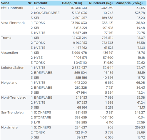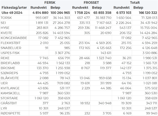 Omsetningen av ferskt råstoff i uke 49 utgjorde 100 millioner kroner, opp fra 82 millioner kroner uken før. Torsk, sei, kveite, kongekrabbe og hyse stod for det meste av ferskomsetningen, jf. tabell 1.