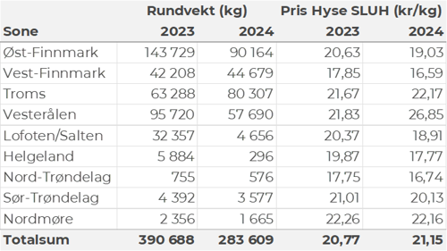 Kvantumet fersklevert hyse i uke 49 var 280 tonn til verdi 4,3 millioner kroner, opp fra 230 tonn og 3,4 millioner kroner uka før. Vel halvparten var tatt på line/autoline. Etterfulgt av 100 tonn på snurrevad og 20 tonn på garn. Spredt fiske fra Finnmark til Vesterålen, jf. tabell 5, størst kvantum levert i Øst-Finnmark med 90 tonn.