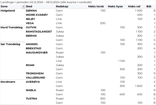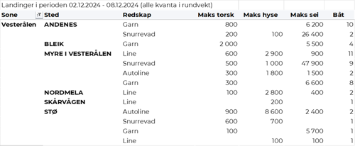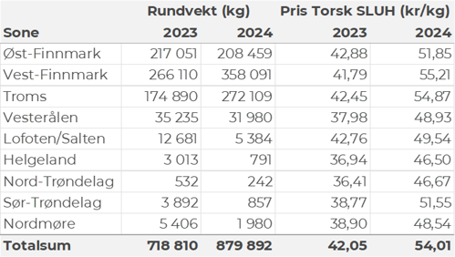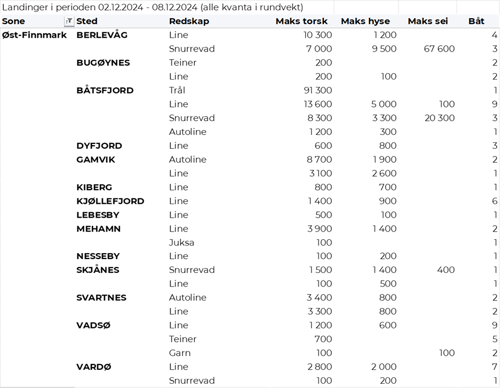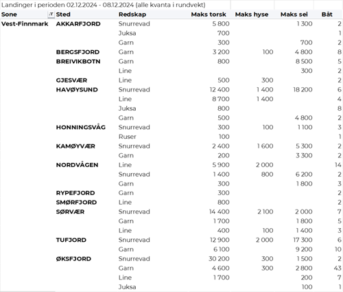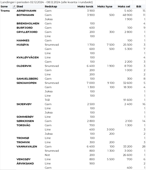 Omsetningen av fersk torsk i uke 49 utgjorde 990 tonn til en verdi av 36 millioner kroner, opp fra 690 tonn og 24 millioner kroner uken før. 380 tonn var tatt på garn, 280 tonn på snurrevad, 230 tonn på line/autoline og 90 tonn på trål. Av garntorsken var 240 tonn levert i Troms og 110 tonn i Vest-Finnmark. 210 tonn av snurrevadtorsken var levert i Vest-Finnmark, og 30-40 tonn på hver av Øst-Finnmark og Troms. Linekvantumet var i hovedsak levert i Øst-Finnmark med 170 tonn og nærmere 50 tonn i Vest-Finnmark. Trålkvantumet var levert i Båtsfjord.