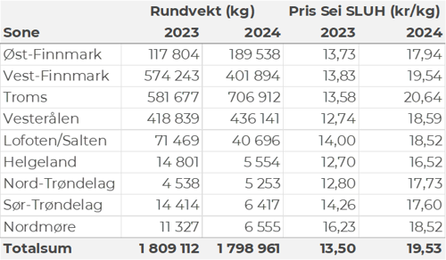 Omsetningen av fersk sei i uke 49 utgjorde 1.890 tonn til en verdi av 27,3 millioner kroner, på samme nivå som uka før. 990 tonn var tatt på garn, 740 tonn på snurrevad, 90 tonn på trål, og mindre kvanta på not, line og juksa. Av garnseien var 540 tonn levert i Troms, 220 tonn i Vest-Finnmark og 175 tonn i Vesterålen. Snurrevadseien var mer jevnt fordelt geografisk fra Øst-Finnmark til Vesterålen med en topp på sistnevnte der 250 tonn var levert. Trålkvantumet var levert på Senja. Totale leveranser på alle redskaper unntatt trål, pr geografiske område framgår av tabell 4 med tilhørende snittpriser betalt.