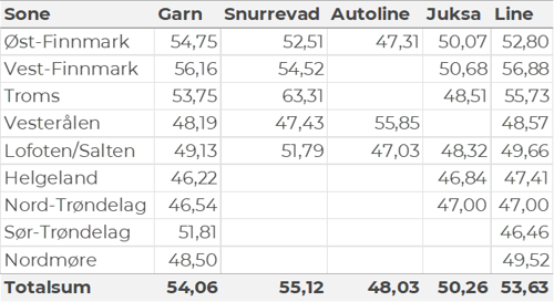 Tabell 2 og 3 viser fordelingen av landingene av fersk torsk pr leveringssone og redskap (unntatt trål), med tilhørende snittpriser. De to tabellene er basert på omsetning av kvalitet A og ekstra, der alle leveringstilstander inngår, men der snittprisene er omregnet til sløyd uten hode-priser, eksklusiv restråstoff.