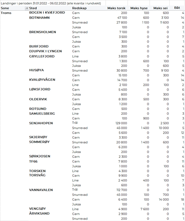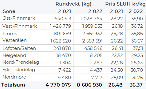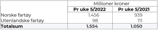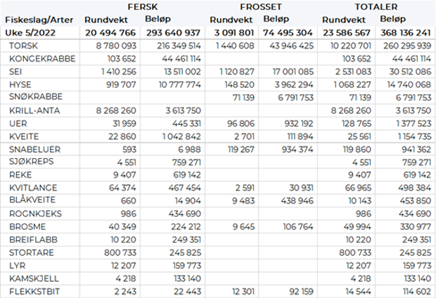 Totalomsetningen hittil i år sammenlignet med tilsvarende periode i fjor framgår av tabell 1. Den økte omsetningen for norske båter er på 517 millioner kroner, fordelt med pluss på 311 på fersk- og 206 på frystomsetningen. Frystomsetningen er pr uke 5 i år på 628 millioner kroner, mens ferskomsetningen er oppe i 829 millioner kroner. En stor del av den økte frystomsetningen skriver seg fra sluttspurten i 2021 der kvantumet er omsatt på begynnelsen av 2022. Omsetningen av fryst torsk pr uke 5 i år er 394 millioner kroner mot 277 millioner kroner til samme tid i fjor, av kvantum på henholdsvis 14.470 og 13.530 tonn. Også fryst sei og hyse har ei fin øking både i kvantum og verdi. Når det gjelder omsetningen av fersklevert råstoff, drar torsken opp både pga. økte priser og økt kvantum. Kvantum fersk torsk omsatt så langt er 19.730 tonn, mot 15.060 tonn til samme tid i fjor, verdien er opp fra 289 til 499 millioner kroner. Omsatt kvantum fersk sei er ned fra 8.500 til 7.830 tonn, men verdien er opp fra 61 til 75 millioner kroner. Kongekrabbekvantumet er opp fra 374 til 427 tonn, og som følge av økte priser er verdien mer enn doblet, fra 79 til 174 millioner kroner.