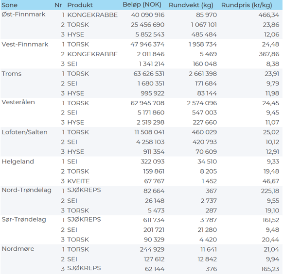 Omregnet til rundpriser, for NOR-fartøy, fersk, A og krokfanget kvalitet, hovedprodukter (uten kaisalg og etterbetaling)