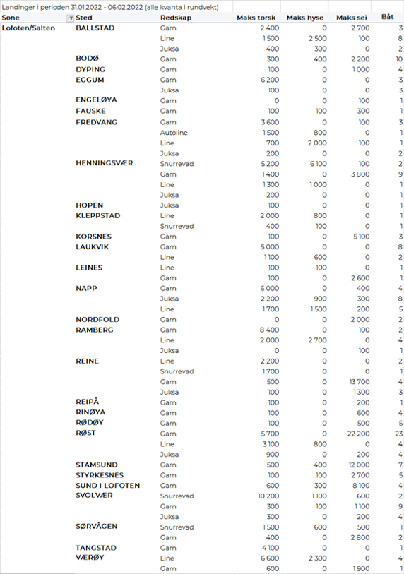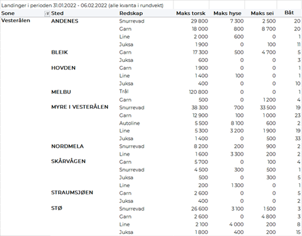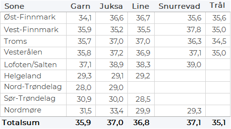Omsetningen av ferskt råstoff i uke 5 utgjorde 294 millioner kroner, opp fra 201 millioner kroner uka før. Av det utgjorde 8.780 tonn fersk torsk 216 millioner kroner, jf tabell 2. Tabell 3 viser andelen av dette kvantumet registrert med kvalitet A og Ekstra på sluttseddel, og tilhørende snittpriser pr leveringssone, sammenlignet med samme uke i fjor. Tabell 4 viser tilsvarende snittpriser oppnådd i uke 5 fordelt på redskapene garn, juksa, line, snurrevad og trål. Totalen på 8.780 tonn omsatt i uke 5 var fordelt med 3.560 tonn tatt på snurrevad, 3.370 tonn på garn, 900 tonn på trål, 780 tonn på line/autoline og 165 tonn på juksa. Størst snurrevadkvantum var levert i Vesterålen med 1.570 tonn, deretter fulgte Vest-Finnmark med 950 tonn, Troms med 860 tonn, Øst-Finnmark med 140 tonn og Lofoten med 25 tonn. Garnkvantumet var fordelt med 1.480 tonn levert i Troms, 800 tonn i Vest-Finnmark, 670 tonn i Vesterålen, 330 tonn i Lofoten, 75 tonn i Øst-Finnmark og 15 tonn i området Helgeland-Nordmøre. Trålkvantumet på totalt 900 tonn var levert med 400 tonn i Øst-Finnmark, 240 tonn i Troms, 130 tonn i Vest-Finnmark og 120 tonn i Vesterålen. Av linekvantumet var 440 tonn levert i Øst-Finnmark, 120 tonn i Vesterålen, og 60-80 tonn hver på Vest-Finnmark, Troms og Lofoten. Juksakvantumet på totalt 165 tonn var geografisk fordelt med 100 tonn levert Vesterålen, 25 tonn hver på Vesterålen og Lofoten, og for øvrig mindre kvanta.