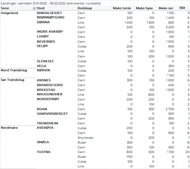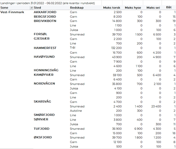Omsetningen av fersk sei i uke 5 utgjorde 1.410 tonn til verdi 13,5 millioner kroner. En økning fra 1.200 tonn til verdi 11,6 millioner kroner uken før. Av totalen er 39 tonn landet i Øst-Finnmark hvorav 32 tonn fra snurrevad. 160 tonn er landet i Vest-Finnmark hvorav 146 tonn er tatt på snurrevad. I Troms er det landet 172 tonn hvorav 126 tonn fra snurrevad. I Vesterålen er det landet 548 tonn, der 439 tonn er tatt på snurrevad. I Lofoten er det landet 421 tonn, hvorav 410 tonn er tatt på garn. På Helgeland er det landet 35 tonn, der 32 tonn er tatt på garn. Mindre kvanta i resterende soner.