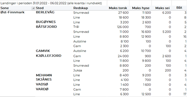 Omsetningen av fersk hyse i uke 5 utgjorde 920 tonn til verdi 10,7 millioner kroner, en økning fra uken før da det var omsatt 523 tonn til verdi 6,1 millioner kroner. Av totalen er 487 tonn landet i Øst-Finnmark som også har størst andel av totalkvantumet. Line/autoline er største redskap med 430 tonn av dette kvantumet. Øst-Finnmark er også den sonen med størst økning fra uken før. I Vest-Finnmark er det landet 35 tonn, hvorav 25 tonn fra snurrevad. Troms står for 83 tonn, hvorav 51 tonn er tatt på line. I Vesterålen er det landet 228 tonn hvorav 158 tonn på snurrevad. Lofoten står for 71 tonn, hvorav 47 tonn tatt på line/autoline. Mindre kvanta i resterende soner.