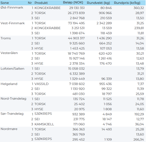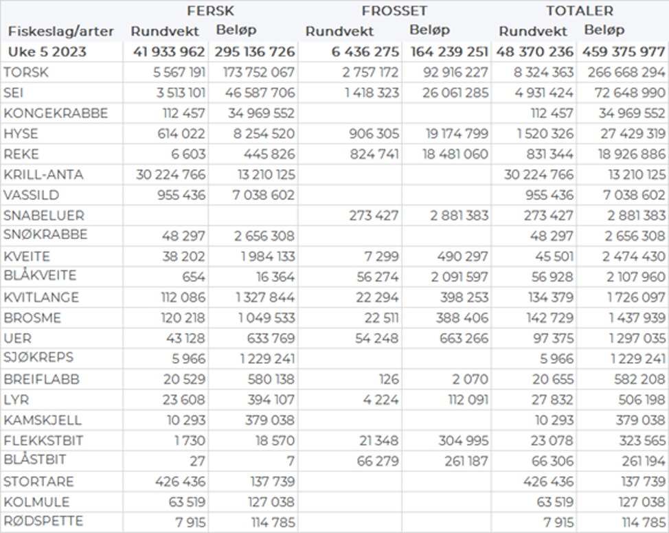 Omsetningen av ferskt råstoff i uke 5 ble 295 millioner kroner, opp fra 82 millioner kroner i uke 4. Torsk, sei og kongekrabbe var størst i verdi med henholdsvis 174, 47 og 35 millioner kroner, og for øvrig slik det framgår av tabell 1.