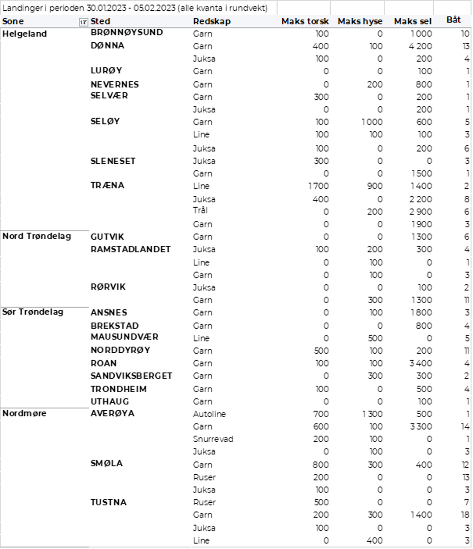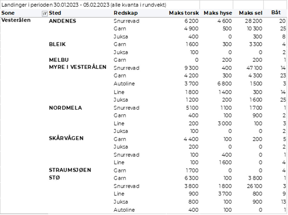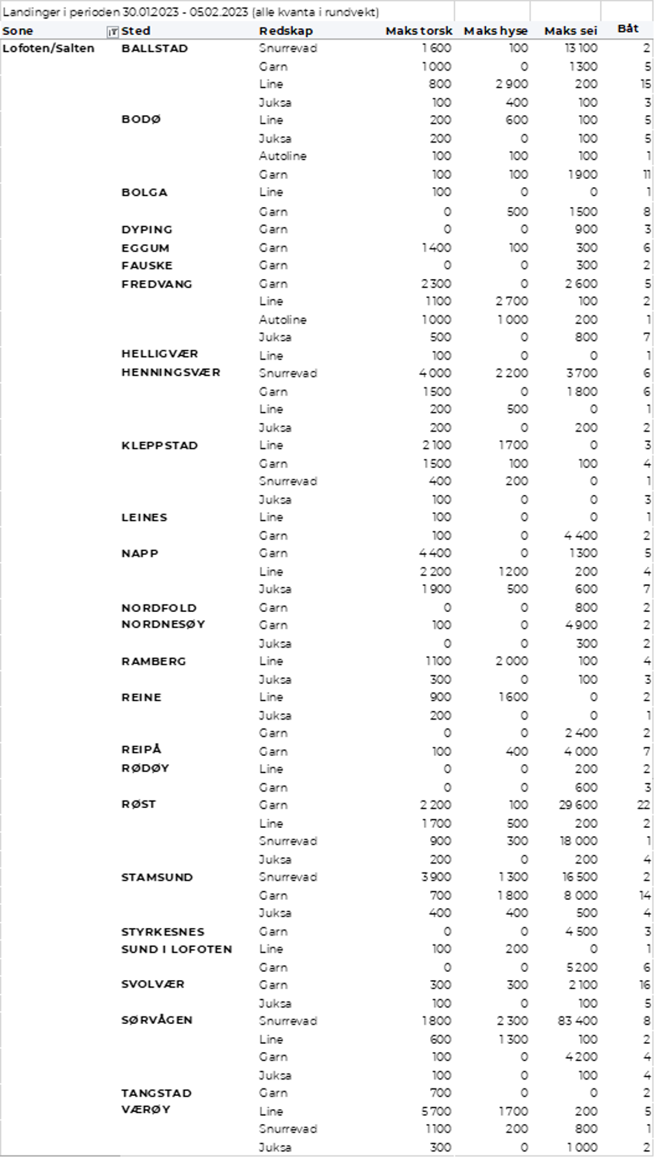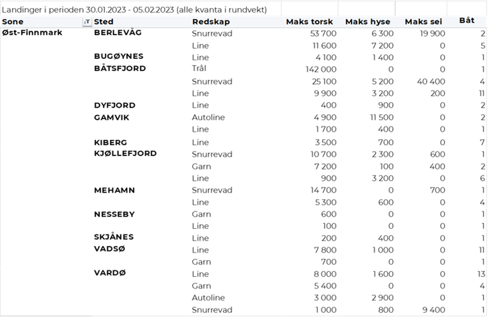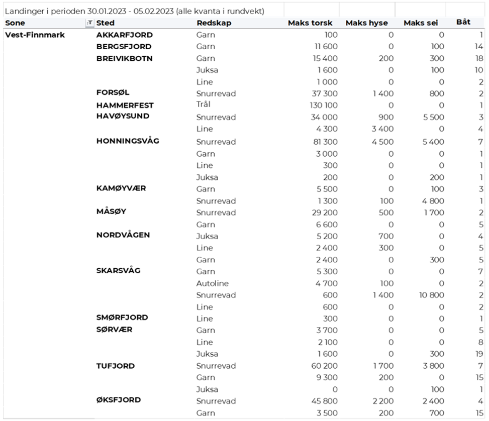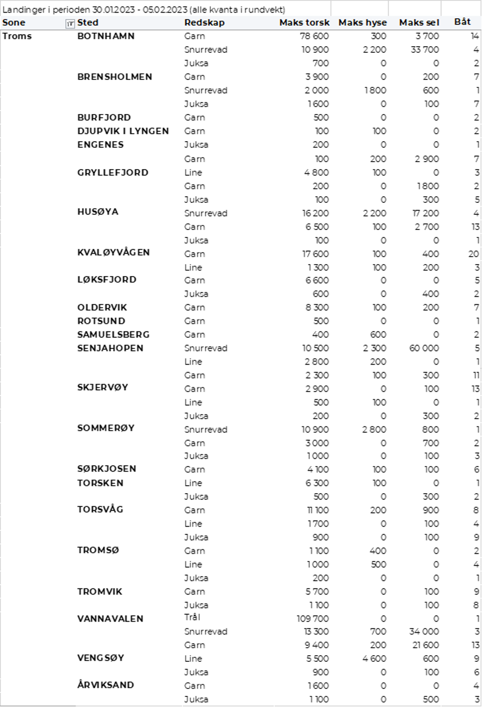 Omsetningen av fersk torsk i uke 5 utgjorde 5.570 tonn til verdi 174 millioner kroner, som var opp fra 1.010 tonn og 32 millioner kroner i uke 4, ei uke som var sterkt preget av uvær. 2.380 tonn var tatt på garn, 2.000 tonn på snurrevad, 560 tonn på line/autoline, 510 tonn på trål og 120 tonn på juksa. 1.020 tonn av garnkvantumet var levert i Troms, 920 tonn i Vest-Finnmark, 260 tonn i Vesterålen og 100 tonn i Lofoten. Av snurrevadkvantumet var 1.190 tonn levert i Vest-Finnmark og 210-290 tonn på hver av Øst-Finnmark, Troms og Vesterålen. Linekvantumet var i hovedsak levert i Øst-Finnmark. Trålkvantumet var levert i Øst-Finnmark med 270 tonn, 130 tonn i Vest-Finnmark og 110 tonn i Troms. Juksafisket var spredt, med størst landinger i Øst-Finnmark med 45 tonn og Vest-Finnmark med 30 tonn.