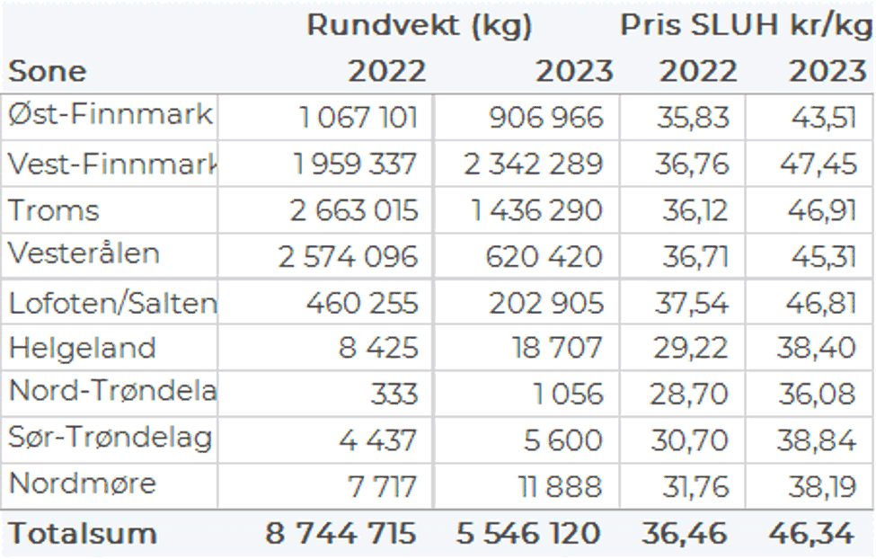 Tabell 1: Omsetning for norske båter i uke 5/2023, fordelt pr fersk/fryst og pr fiskeslag