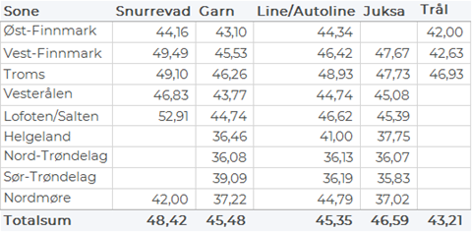 Omregnet til rundpriser, for NOR-fartøy, fersk, A og krokfanget kvalitet, hovedprodukter (uten kaisalg og etterbetaling).