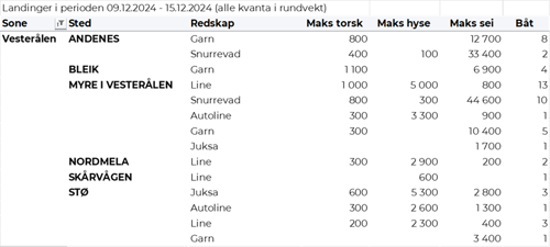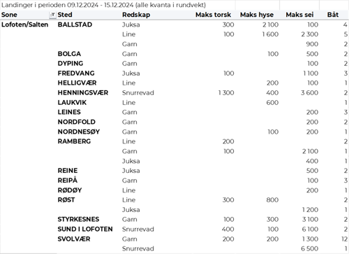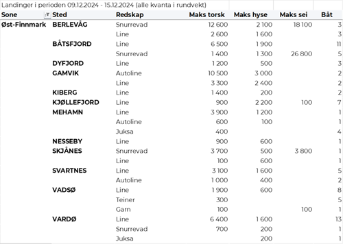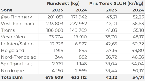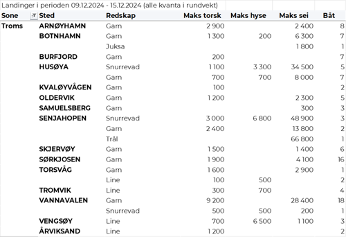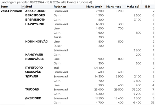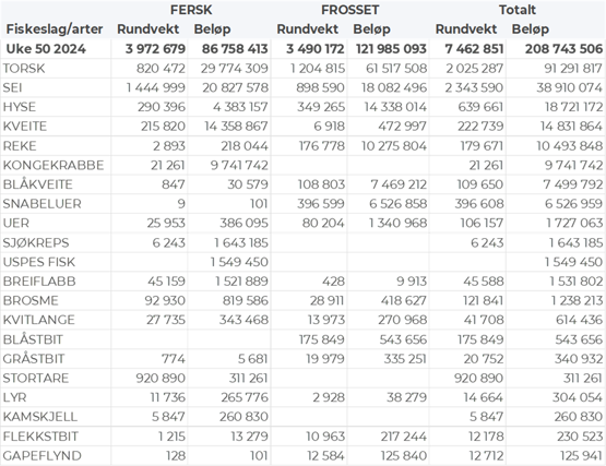 Omsetningen av fersk torsk i uke 50 utgjorde 820 tonn til en verdi av 30 millioner kroner, ned fra 990 tonn og 36 millioner kroner uken før. 260 tonn var tatt på garn, 230 tonn på snurrevad, 170 tonn på trål og 160 tonn på line/autoline. Av garntorsken var 140 tonn levert i Troms og 100 tonn i Vest-Finnmark. 170 tonn av snurrevadtorsken var levert i Vest-Finnmark, og 50 tonn i Øst-Finnmark. Trålkvantumet var levert i Rypefjord. Linekvantumet var i hovedsak levert i Øst-Finnmark med 125 tonn.