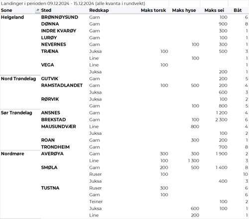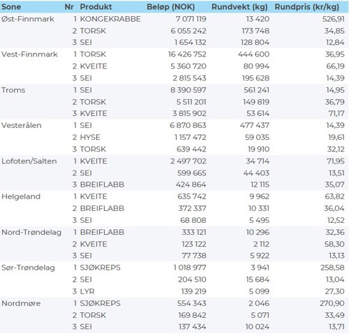 Selv om ruskevær hindret flere båter fra å fiske i begynnelsen av forrige uke, ble det levert nesten like mye villfanget fisk og skalldyr som uka før. Kystfiskeflåten leverte hele 216 tonn tonn kveite, hvilket er største mengde levert på ei uke så langt i år. I tillegg leverte denne flåtegruppen en økt mengde av kongekrabbe. Salg av ombordfryst fisk fra havfiskeflåten økte også, der halvparten av verdien ble generert fra salg av torsk, og da fremfor alt torsk fanget med trål.