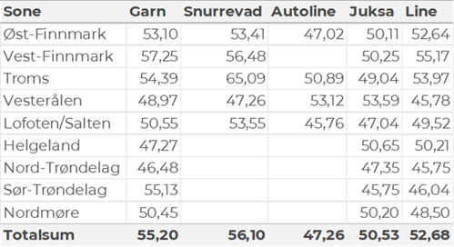 Tabell 2 og 3 viser fordelingen av landingene av fersk torsk pr leveringssone og redskap (unntatt trål), med tilhørende snittpriser. De to tabellene er basert på omsetning av kvalitet A og ekstra, der alle leveringstilstander inngår, men der snittprisene er omregnet til sløyd uten hode-priser, eksklusiv restråstoff.