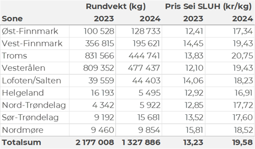 Omsetningen av fersk sei i uke 50 utgjorde 1.440 tonn til en verdi av 20,8 millioner kroner, ned fra 1.890 tonn og 27,3 millioner kroner uka før. 650 tonn var tatt på hver av garn og snurrevad, 120 tonn på trål, og mindre kvanta på juksa og lina. Av garnseien var 290 tonn levert i Troms, 175 tonn i Vesterålen og 130 tonn i Vest-Finnmark. Snurrevadseien var mer jevnt fordelt geografisk fra Øst-Finnmark til Vesterålen med en topp på sistnevnte der 290 tonn var levert. Trålkvantumet var levert på Senja. Totale leveranser på alle redskaper unntatt trål, pr geografiske område framgår av tabell 4 med tilhørende snittpriser betalt.