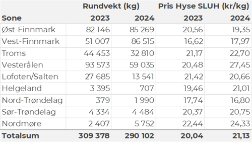 Kvantumet fersklevert hyse i uke 50 var 290 tonn til verdi 4,4 millioner kroner, på samme nivå som uka før. Halvparten var tatt på line/autoline. Etterfulgt av 110 tonn på snurrevad og 15-20 tonn på hver av juksa og garn. Spredt fiske fra Finnmark til Vesterålen, jf. tabell 5, størst kvantum levert i Øst- og Vest-Finnmark med 85 tonn på hver.