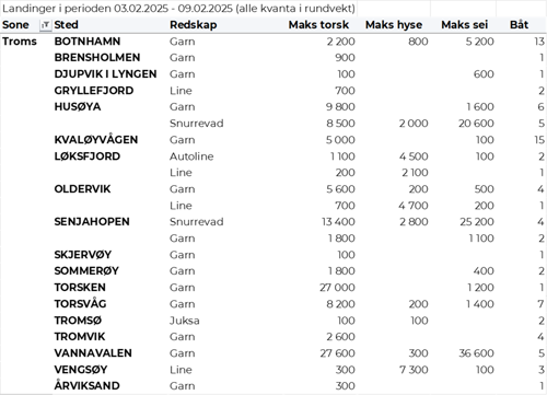 Omsetningen av fersk torsk utgjorde 1.320 tonn til verdi 66 millioner kroner, ned fra 2.580 tonn og 129 millioner kroner i uke 5. Garn stod for 660 tonn, 370 tonn var tatt på snurrevad, 230 tonn på trål og 50 tonn på line/autoline. 330 tonn av garntorsken var levert i Vest-Finnmark, 260 tonn i Troms, ellers labert. Det meste av snurrevadtorsk var levert i Øst-Finnmark (230 tonn), og for øvrig 50-70 tonn på hver av Troms og Vesterålen. Tråltorsken var levert i Båtsfjord og Rypefjord. Linekvantumet var i hovedsak levert i Øst-Finnmark og Vesterålen.