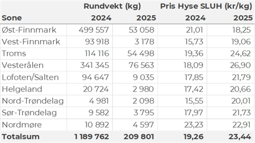 Kvantumet fersklevert hyse i uke 6 var 210 tonn til en verdi av 3,5 millioner kroner, ned fra 670 tonn/11 millioner kroner uken før. Størst aktivitet i Vesterålen, Troms og Øst-Finnmark med 50-75 tonn på hver, og ellers slik det framgår av tabell 5. 100 tonn var tatt på line/autoline, 75 tonn på snurrevad og 35 tonn på garn.