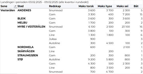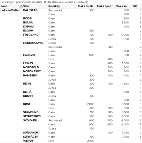 Råfisklagets omsetning hittil i år, pr 9. februar 2025, nærmer seg 1,9 milliard kroner, nærmere bestemt 1.883 millioner kroner. Det er fordelt med 1.667 millioner kroner for norske båter, og 216 millioner kroner for utenlandske. Tilsvarende for fjoråret var 1.864 millioner kroner totalt, hvorav 1.706 var etter landinger fra norske båter og 157 for utenlandske båter.