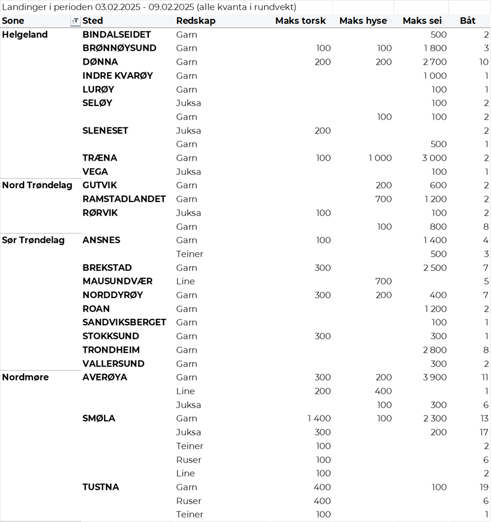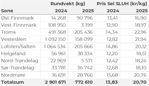 Omsetningen av fersk sei i uke 6 utgjorde 770 tonn til verdi 12 millioner kroner, ned fra 1.650 tonn og 25 millioner kroner i uke 5. Kvantumet i uke 6 var fordelt med 440 tonn tatt på garn og 330 tonn på snurrevad. Garnkvantumet var i hovedsak levert i Lofoten/Salten og Troms med henholdsvis 200 og 90 tonn, og ellers 30-40 tonn på hver av Vesterålen, Helgeland, Sør-Trøndelag og Nordmøre. Av snurrevadfangstene var 120 tonn levert i Vesterålen, 110 tonn i Troms og 90 tonn i Øst-Finnmark.