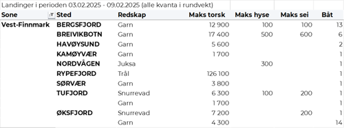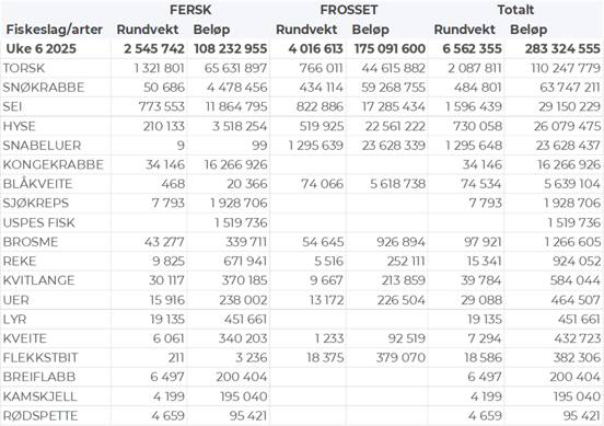 Omsetningen av ferskt råstoff i uke 6 utgjorde 108 millioner kroner, ned fra 237 millioner kroner uka før. Torsken var størst i verdi, fulgt av kongekrabbe, sei, snøkrabbe og hyse til verdi henholdsvis 66, 16, 12, 4 og 4 millioner kroner, og for øvrig slik det framgår av tabell 1.