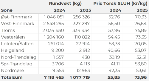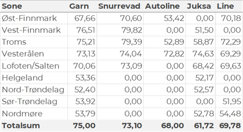 Tabell 2 og 3 viser fordelingen av landingene av fersk torsk pr leveringssone og redskap (unntatt trål), med tilhørende snittpriser. De to tabellene er basert på omsetning av kvalitet A og ekstra, der alle leveringstilstander inngår, men der snittprisene er omregnet til sløyd uten hode-priser, eksklusiv restråstoff.