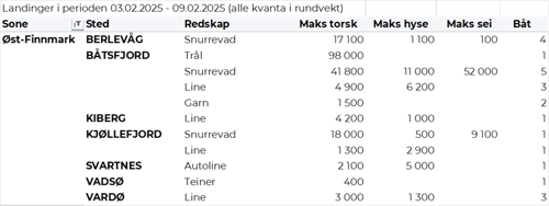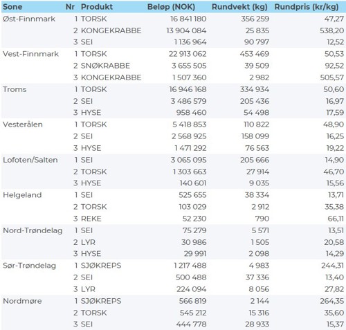 Det var i hovedsak salg av ombordfryst villfanget fisk og skalldyr fra havfiskeflåten som genererte de største verdiene forrige uke. I verdimessig rekkefølge var det disse artene; snøkrabbe, torsk, snabeluer, hyse og sei. Vinterstorm med sterk vind deler av uka hindret mange kystfiskebåter fra å fangste og førte til at selv trålerne søkte ly for uværet innaskjær. Dette gikk naturlig nok ut over leveransene fra kystfiskeflåten, som ble halvert sammenlignet med uka før.