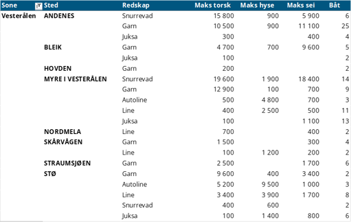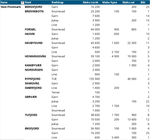 Fordelt på fangstområde ble det i uke 6 fanget mest i Varangerfjorden med 13 tonn, deretter 10 tonn i havområdet mellom Båtsfjord og Berlevåg, 7 tonn i Porsangerfjorden, 4 tonn i Tanafjorden, 3 tonn i Laksefjorden og 2,2 tonn utenfor Gamvik. Kvanta under 1 tonn i resterende fangstområder.