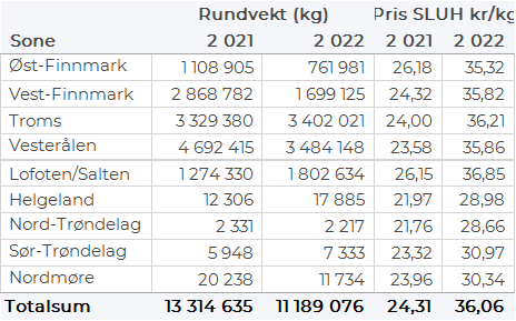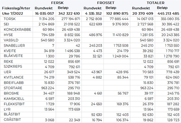 Totalomsetningen hittil i år sammenlignet med tilsvarende periode i fjor framgår av tabell 1. Den økte omsetningen for norske båter er på 960 millioner kroner, fordelt med pluss på 490 på fersk- og 470 på frystomsetningen. Frystomsetningen er pr uke 7 i år på 1.028 millioner kroner, mens ferskomsetningen er oppe i 1.475 millioner kroner. En stor del av den økte frystomsetningen skriver seg fra sluttspurten i 2021 der kvantumet er omsatt på begynnelsen av 2022. Men økt omsetning av fryst råstoff også i uke 6, da ny ukerekord ble satt med 270 millioner kroner. Omsetningen av fryst torsk pr uke 7 i år er 671 millioner kroner mot 337 millioner kroner til samme tid i fjor, av kvantum på henholdsvis 24.030 og 16.430 tonn. Også fryst sei og hyse har ei fin øking både i kvantum og verdi. Når det gjelder omsetningen av fersklevert råstoff, drar torsken opp både pga. økte priser og økt kvantum. Kvantum fersk torsk omsatt så langt er 40.760 tonn, mot 36.970 tonn til samme tid i fjor, verdien er opp fra 667 til 1.013 millioner kroner. Omsatt kvantum fersk sei er litt opp til 11.750 tonn, og verdien er opp fra 82 til 114 millioner kroner. Kongekrabbekvantumet er opp fra 478 til 565 tonn, og som følge av økte priser er verdien mer enn doblet, fra 101 til 234 millioner kroner.