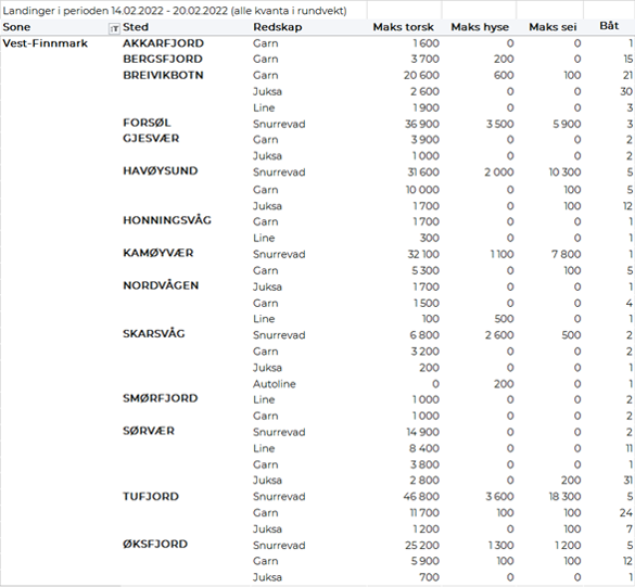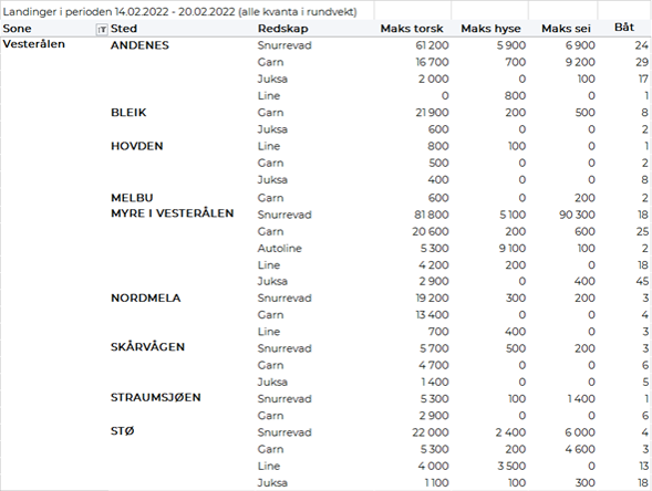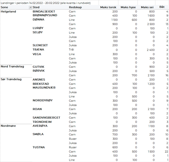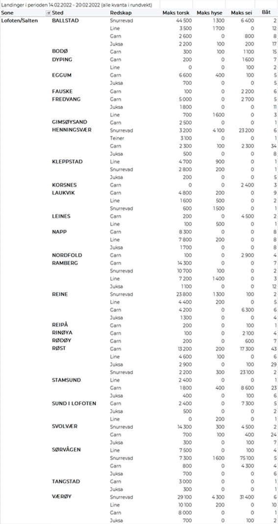 Omsetningen av fersk sei i uke 7 utgjorde 2.105 tonn til verdi 20,9 millioner kroner, opp fra 1.915 tonn/ 19 millioner kroner uken før. Av totalen er 147 tonn omsatt i Vest-Finnmark hvorav 138 tonn fra snurrevad. 66 tonn er landet i Troms hvorav 46 tonn er tatt på snurrevad. I Vesterålen er det landet 448 tonn hvorav 405 tonn fra snurrevad. Lofoten er største sone for leveranser av fersk sei. Totalt ble det landet 1.355 tonn, der 685 tonn ble tatt på garn og 662 tonn ble tatt på snurrevad. Kvanta under 33 tonn i resterende soner.