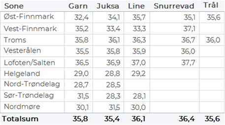 Omregnet til rundpriser, for NOR-fartøy, fersk, A og krokfanget kvalitet, hovedprodukter (uten kaisalg og etterbetaling)