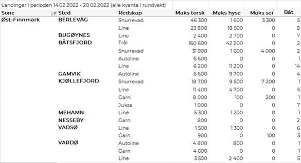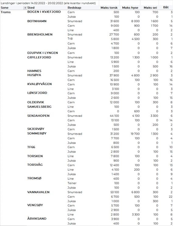Omsetningen av ferskt råstoff i uke 7 utgjorde 342 millioner kroner, opp fra 309 millioner kroner uka før. Av det utgjorde 11.300 tonn fersk torsk 277 millioner kroner, jf tabell 2. Det er første gang i år at ukekvantumet er mer enn 10.000 tonn, opp fra 9.850 tonn uka før. Sist uke er det først og fremst landingene av garntorsk som øker, og geografisk har Lofoten størst øking. Tabell 3 viser andelen av dette kvantumet registrert med kvalitet A og Ekstra på sluttseddel, tatt på redskapene garn, juksa, line, snurrevad og trål, og tilhørende snittpriser pr leveringssone, sammenlignet med samme uke i fjor. Tabell 4 viser tilsvarende snittpriser oppnådd i uke 7 fordelt på de nevnte redskapene. Vesterålen og Troms var jevnstor i kvantum i uke 7 med 3.400-3.500 tonn på hver, der Troms øker sitt kvantum fra 2.700 tonn uka før mens Vesterålen holder stabilt kvantum. Lofoten har størst øking, øker med 1.000 tonn til 1.800 tonn i uke 7. 1.730 tonn levert i Vest-Finnmark, litt ned fra uka før, mens Øst-Finnmark holder samme nivå som uka før med 790 tonn hvorav nær halvparten var tråltorsk. Fremdeles labert med torskelandinger i området Helgeland-Nordmøre. Totalen på 11.300 tonn omsatt i uke 7 var fordelt med 4.830 tonn tatt på snurrevad, opp 220 tonn fra uka før, 4.750 tonn på garn som var opp 1.000 tonn fra uke 6, 810 tonn på line/autoline, 300 tonn på trål, og 600 tonn på juksa som mer enn doblet sitt kvantum fra uka før. Størst snurrevadkvantum var levert i Vesterålen med 2.150 tonn der det meste dreier seg om Myre og Andenes, deretter fulgte Troms med 1.310 tonn, Vest-Finnmark med 790 tonn, Lofoten med 300 tonn og Øst-Finnmark med 270 tonn. Garnkvantumet var fordelt med 1.900 tonn levert i Troms, 1.080 tonn i Vesterålen, 1.010 tonn i Lofoten, 700 tonn i Vest-Finnmark, 30 tonn i Øst-Finnmark og 30 tonn i området Helgeland-Nordmøre. Av linekvantumet på totalt 810 tonn var 350 tonn levert i Lofoten, 190 tonn i Øst-Finnmark og 75-100 tonn på hver av Vest-Finnmark, Troms og Vesterålen. Spredt juksafiske med 110-170 tonn på hver av områdene Vest-Finnmark, Troms, Vesterålen og Lofoten. Det meste av trålkvantumet var levert i Øst-Finnmark.