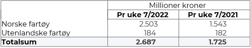 Tabell 2: Omsetning for norske båter i uke 7, 2022, fordelt pr fersk/fryst og pr fiskeslag.