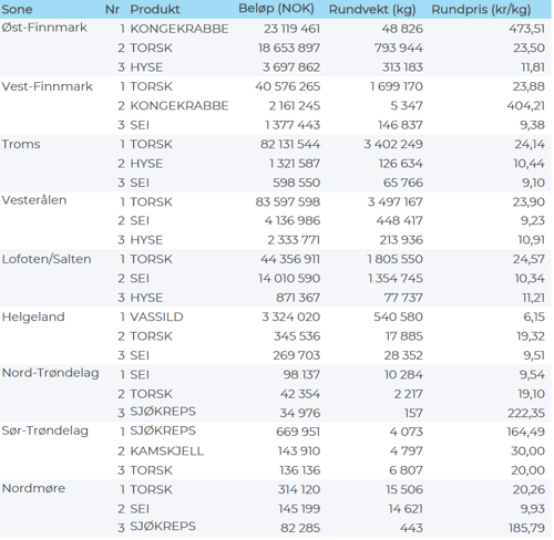 I uke 7 ble det omsatt 61 tonn kongekrabbe til 26,4 millioner kroner, ned fra 72 tonn/ 31 millioner kroner uken før. Av dette er 58 tonn tatt i det regulerte fisket av 172 båter, og 2 tonn er tatt i det uregulerte fisket av 27 båter. A-kvalitets hannkrabbe i det regulerte fisket ble betalt med gjennomsnittlig 497 kr/kg som er uendret fra uken før. Fordelt per fangstområde og for regulert og uregulert samlet var det størst aktivitet i området mellom Tanafjorden og Berlevåg der det er tatt 17 tonn, 20 tonn er tatt i Varangerfjorden og 10 tonn i Tanafjorden. Kvanta under 4 tonn i resterende fangstfelt.