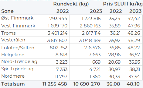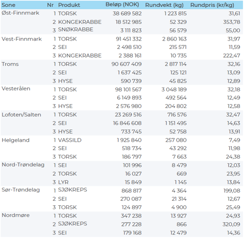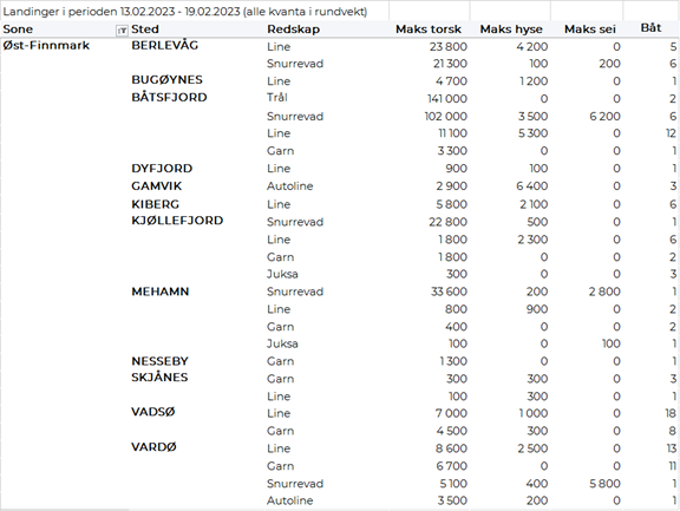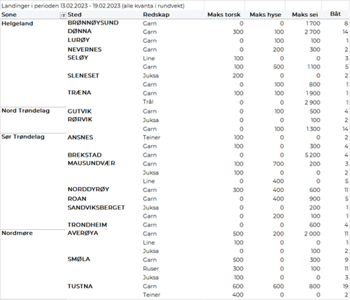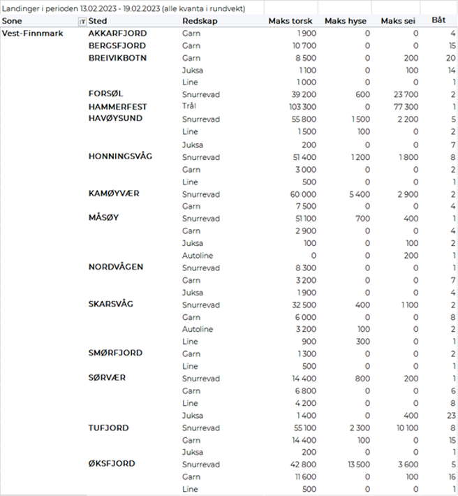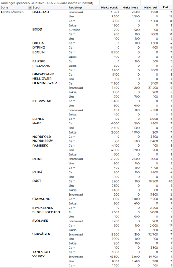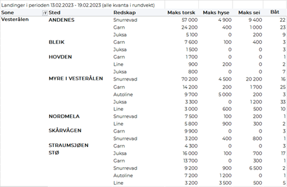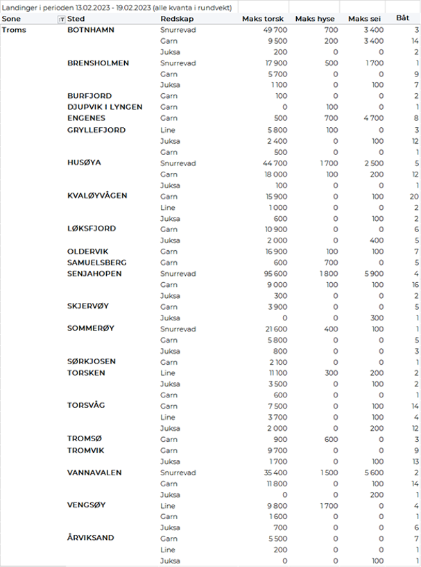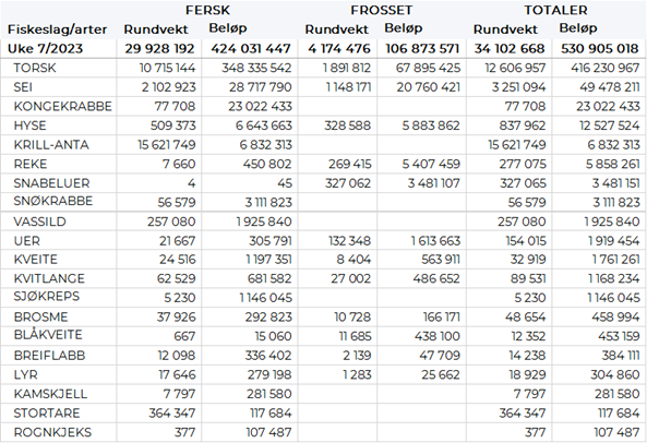 Omsetningen av fersk torsk i uke 7 utgjorde 10.715 tonn til en verdi av 348 millioner kroner. Dette er den høyeste ukesomsetningen så langt i 2023 og en betydelig økning fra en uværspreget uke 6 når det var omsatt «bare» 1.560 tonn til verdi 51 millioner kroner. Fordelt per redskap viser tallene 6.100 tonn fra snurrevad, 3.406 tonn fra garn, 583 tonn fra line/autoline og 296 tonn fra juksa. Største leveringssone er Vesterålen med 3.051 tonn. Deretter følger Vest-Finnmark med 2.864 tonn som er knepent foran Troms med 2.829 tonn. Deretter følger Øst-Finnmark med 1.224 tonn og Lofoten med 719 tonn. Kvanta under 14 tonn i resterende soner.